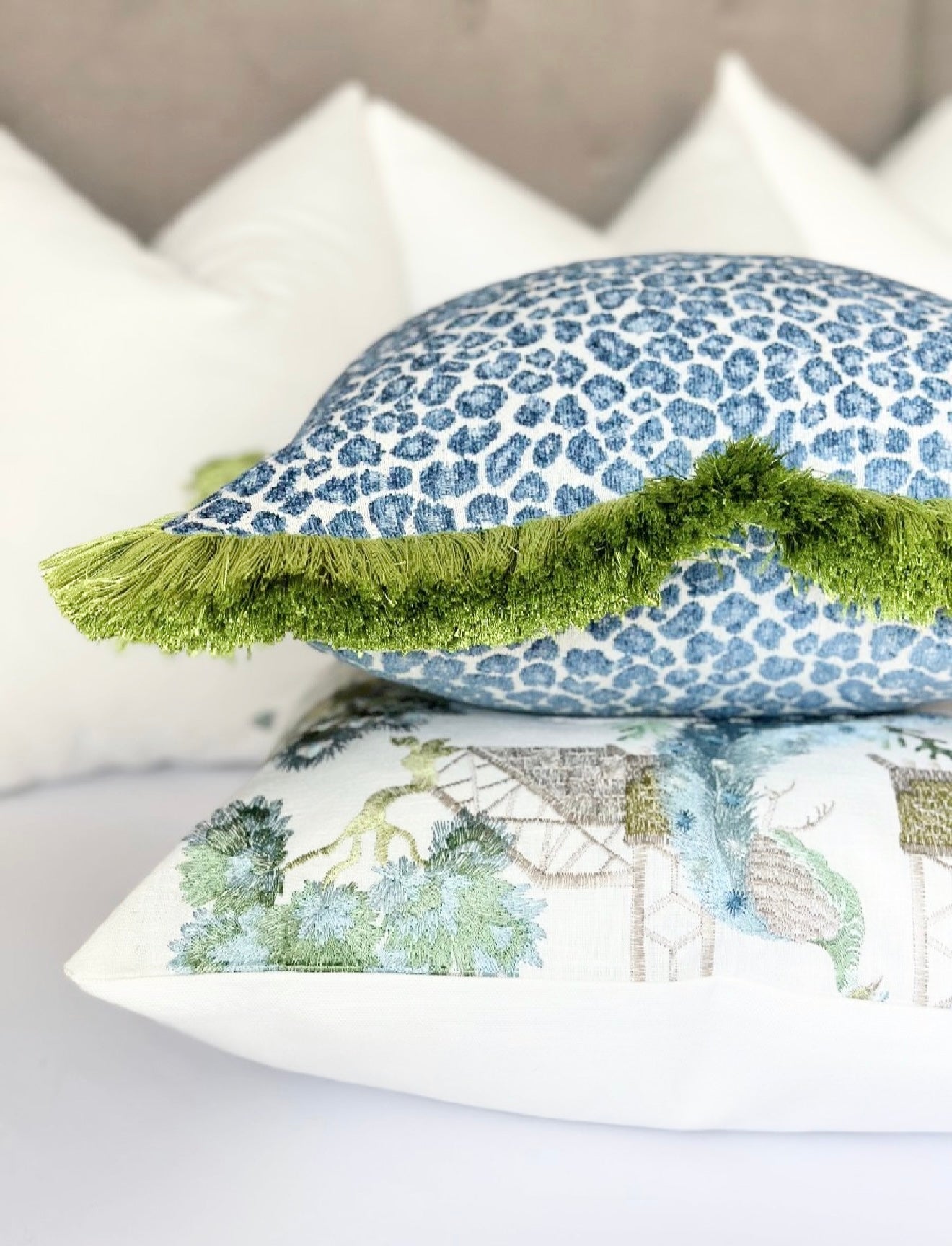 Cheetah Pillow Cover with Green Brush Fringe Detail