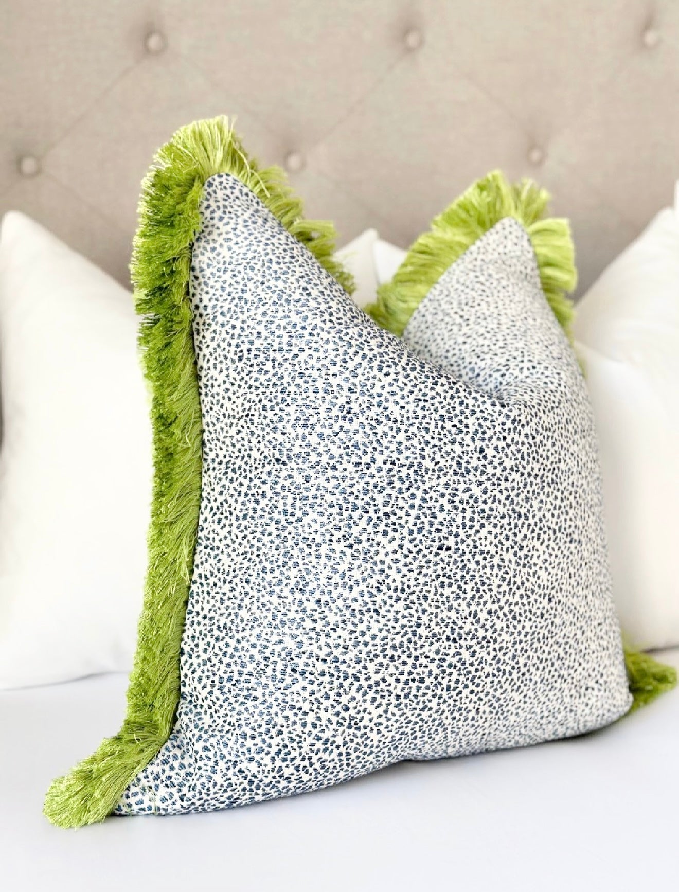Azure spotted throw pillow cover with green brush fringe detail